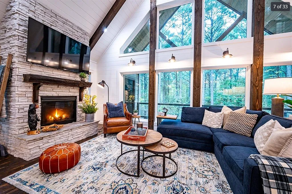 Step into the breathtaking open-concept living room, where soaring vaulted ceilings with exposed beams draw your eyes upward, and massive triangular windows bathe the space in golden natural light and treetop serenity. Curl up on the deep, comfy sectional sofa (perfect for movie nights on the large mounted smart TV), or kick back in the rich leather armchair with a hot cocoa in hand.