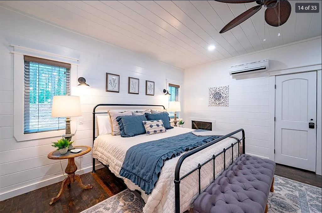 Escape to the luxurious primary bedroom – a serene haven designed for total relaxation. Slip into the plush king-size bed with its elegant black metal frame, dressed in soft linens, ruffled throws, and cozy blue-and-neutral pillows. Matching bedside tables with warm lamps, a stylish tufted bench at the foot, and a tropical palm-leaf ceiling fan create the perfect cozy retreat, with French doors opening directly to the covered porch for effortless indoor-outdoor flow.
