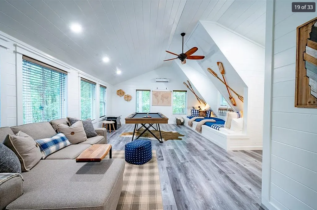 Nautical-inspired decor, including crossed wooden paddles on the shiplap walls, a world map artwork, and warm lighting, adds playful charm and adventure vibes. Whether you're racking up balls for billiards, enjoying a movie night, or simply gazing out at the forest canopy, this loft is the heart of indoor fun and relaxation at Oklahoma Sky.