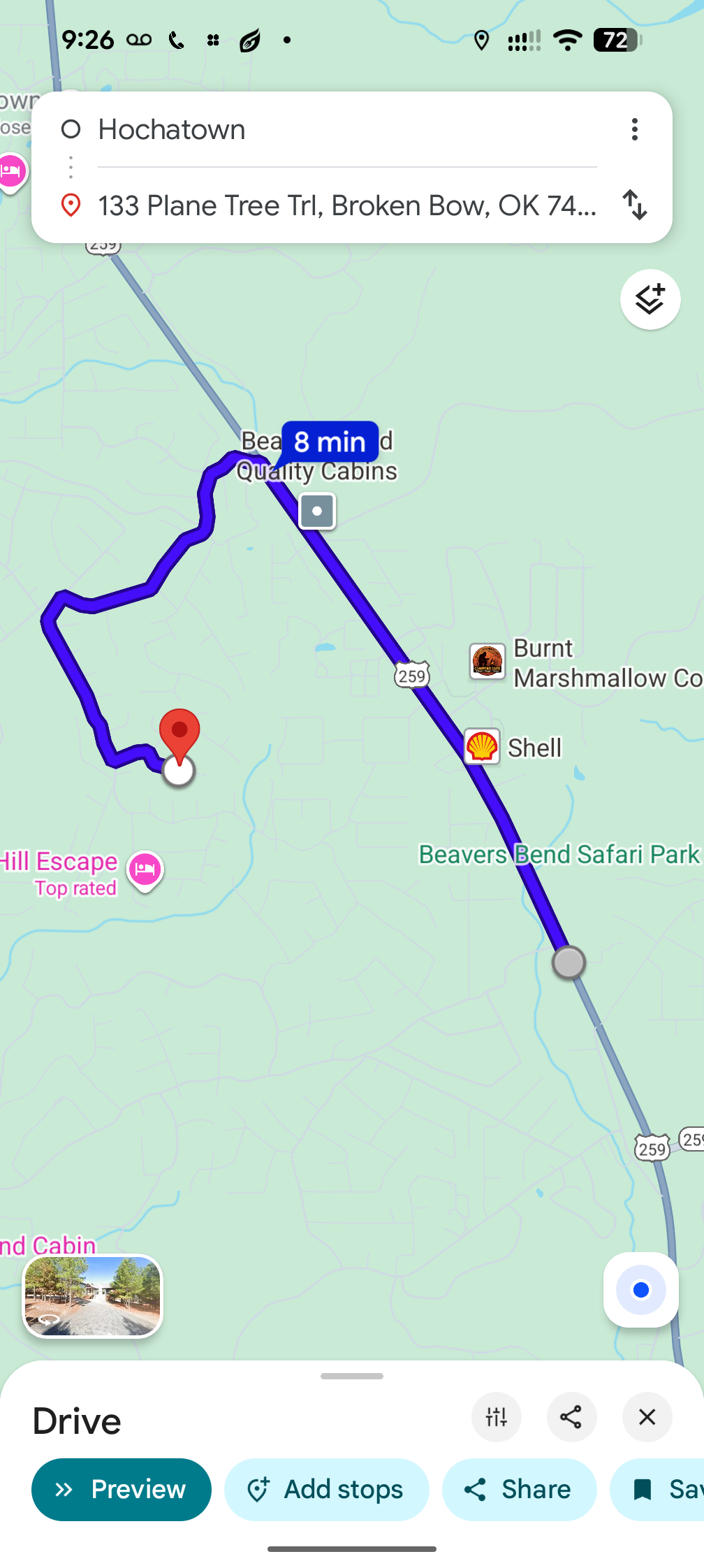 Look for the turn onto Lukfata Trail (marked by landmarks like Hochatown Distilling Co., Shuck Me, or Mountain Fork Brewery—if you've passed these, you're close).